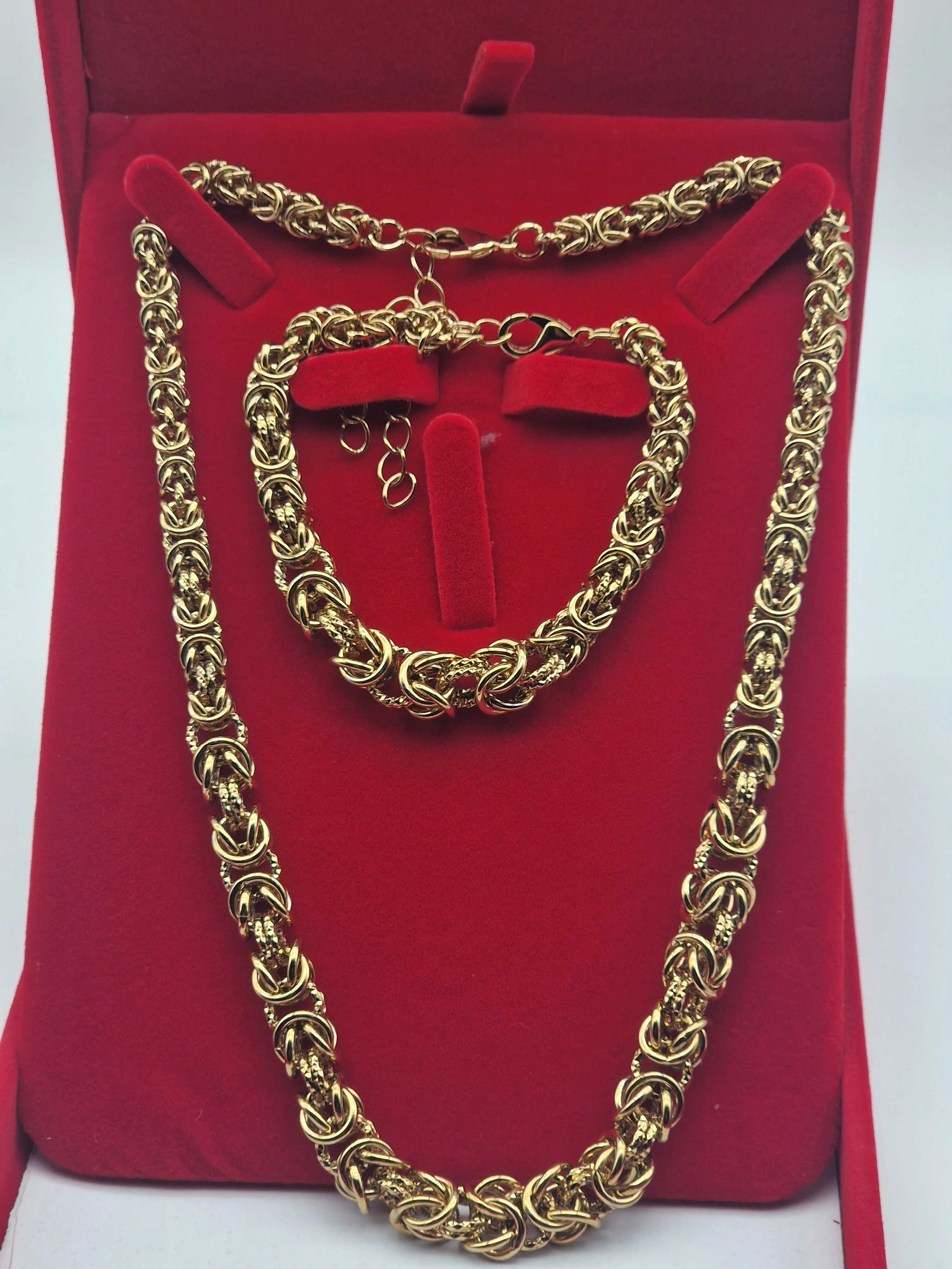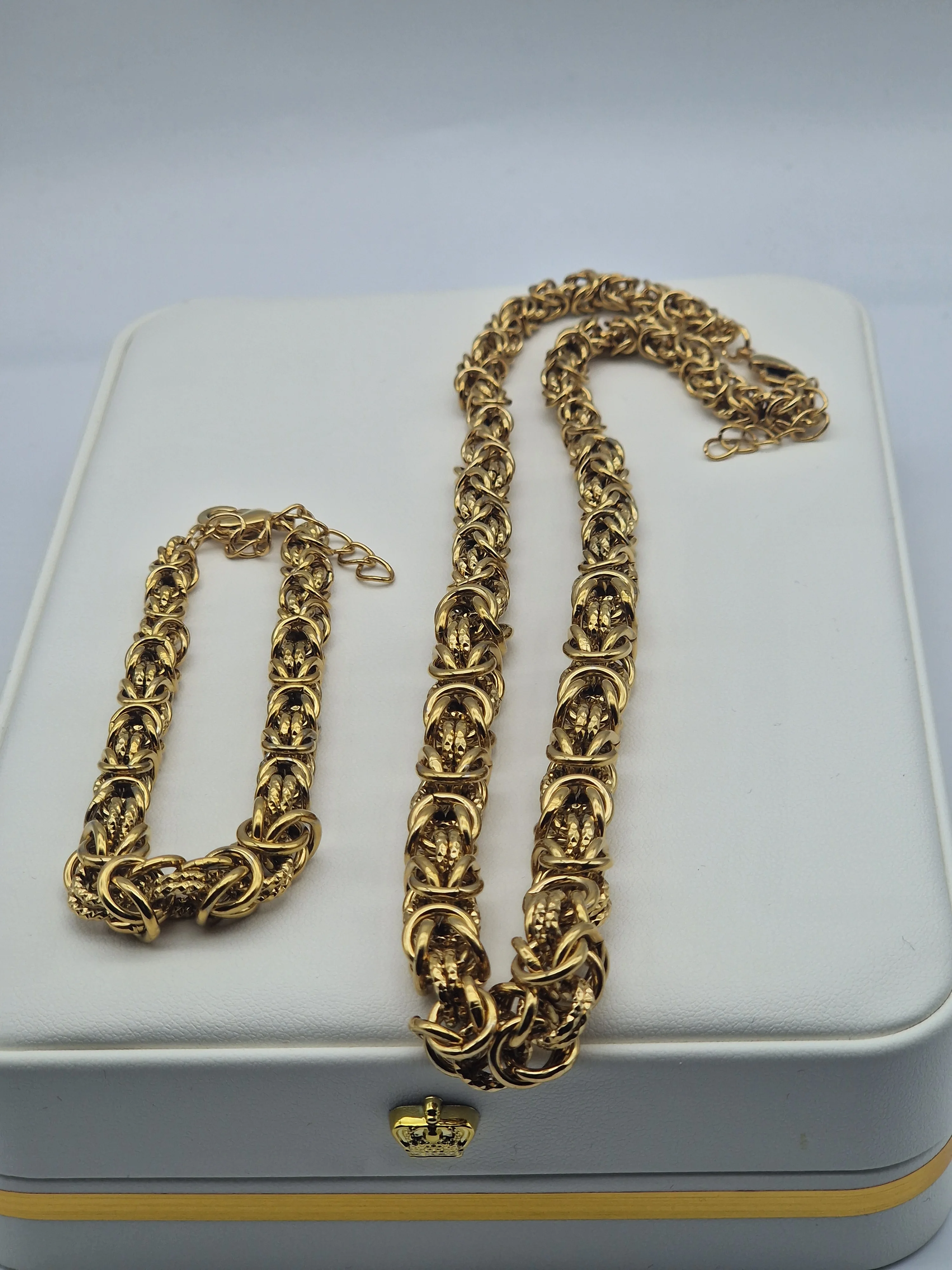 الطقم الملكي - فخامة و رقيسلسلة وبراسلي بجودة عالية ولمعان ذهبي ثابت، ستايل فخم كيعطيك حضور مميّز.كجيك معاه الكرانتي ديالو باش تكوني مرتاحة فاختيارك ✨ شري وانت مرتاحة: التوصيل فابور وكتخلصي من بعد ما تتأكدي من الطلبية ديالك.